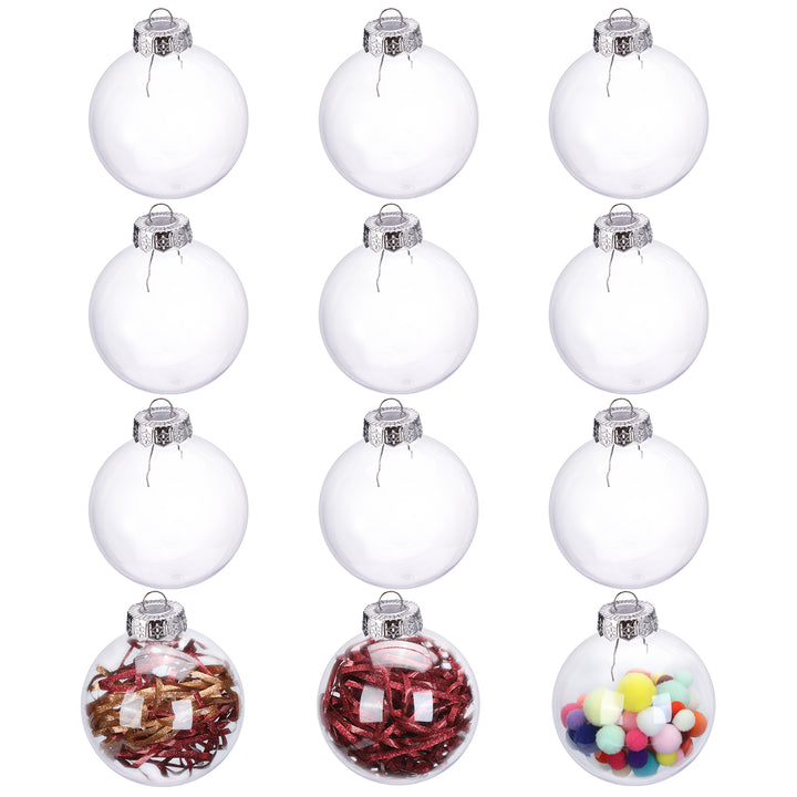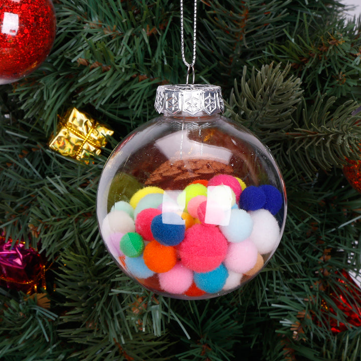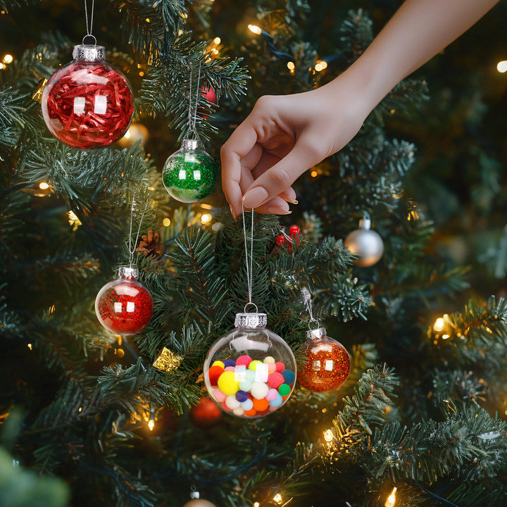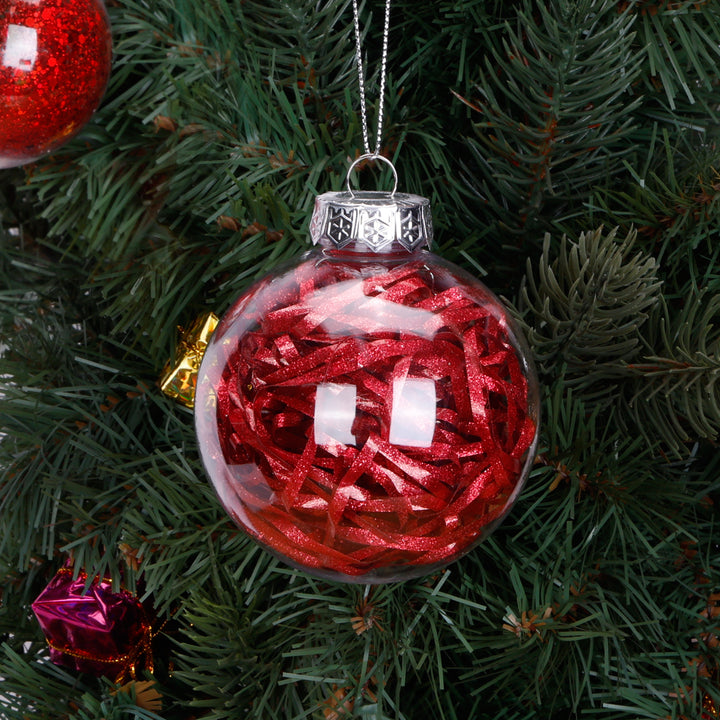 FILLABLE ORNAMENTS BALLS:Each clear fillable ball has a removable silver metal cover and put some small objects inside.Slip a piece of silver ribbon through the loop in order to hang